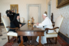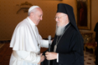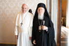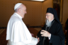 Le 17 septembre, le Pape François et le Patriarche Bartholomée ont eu une rencontre privée au Vatican. Le Patriarche est venu à Rome du 15 au 18 septembre à l’occasion d’un colloque marquant le 50e anniversaire de la Société du droit des Églises orientales, dont il fut le premier vice-président. Le 16 septembre, le Patriarche a prononcé la conférence inaugurale [EN] du colloque à l’Institut Pontifical Oriental avant de célébrer des vêpres à l’église San Teodoro al Palatino.