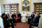 Le Pape François et le Cardinal Koch s'entretiennent avec des représentants du WJC, le 3 septembre 2013. De gauche à droite : Claudio Epelman, Jack Terpins et Ronald S. Lauder, Président du WJC, et le Révérend Père Norbert Hofmann, SDB.